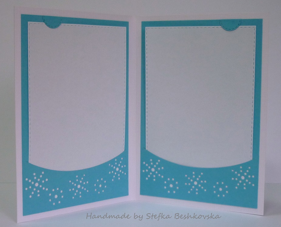 Реших вътре вместо ъгълчета за снимки да направя джобчета, декорирани с нещо напомнящо снежинки. Разбира се съобразих размера със стандартния 9х13см и стана симпатично... обаче като пъхнах НЕкартонено листче увисваше в горната част и се наложи да измисля как да фиксирам при вече готови картички. Превъртях  доста идеи (копче, снежинка, оранжева лентичка, ъгълчета...) и както обикновено най-простичката спечели - сложих асиметрично малки полукръгчета, които дискретно да свършат работата. Показаха ми ги вече със снимка вместо бялото листче и съм много удовлетворена!