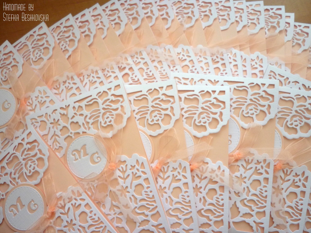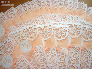 Исках да не се меся в решенията - показах какво изрязва щанцата с която разполагам (и се доближава най-много до това което булката харесва) и някак стигнахме до това което желаят младоженците и едновременно с това най-лесният от технологична гледна точка модел. Свършихме работата изненадващо бързо. Ако избирах аз, щяха да са със сатенени панделки, но и така са ОК. Важното е, че младоженците са доволни ;).