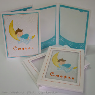 Новото бебе е Стефан (очевидно кръстено на мен!... шегувам се). И за да са сезонни неговите картички мама пожела този път да е без щъркел, че още не са долетели и фонът да е на снежинки. Искаше да има повече цвят, та затова тегелите и буквите не са сини а ярко оранжеви... лесно е когато поръчителят знае какво иска.